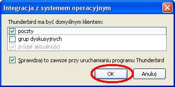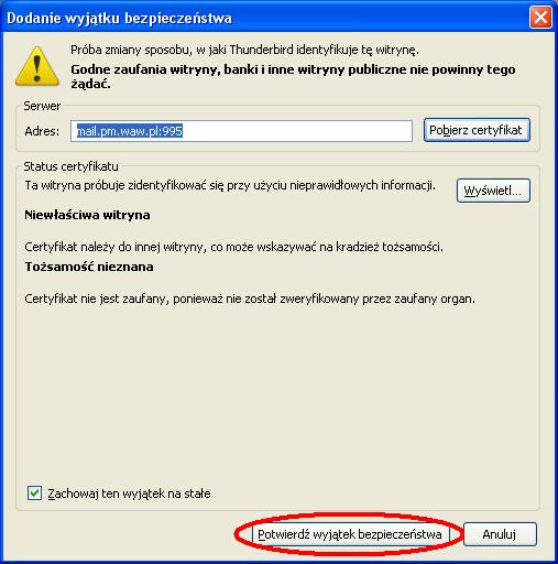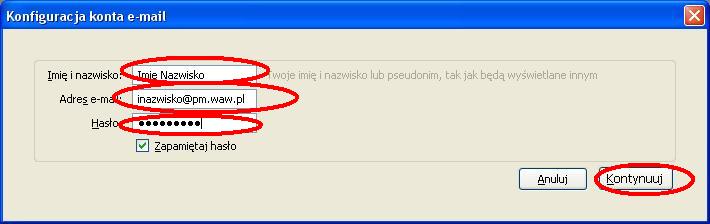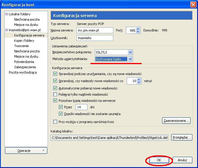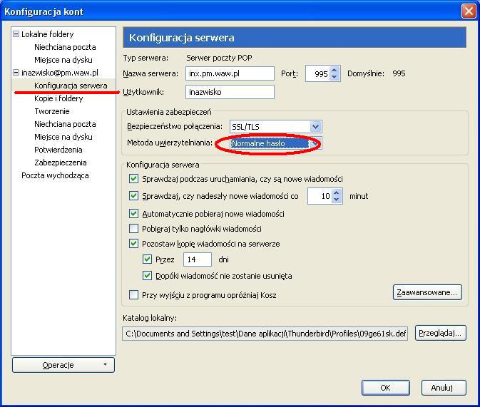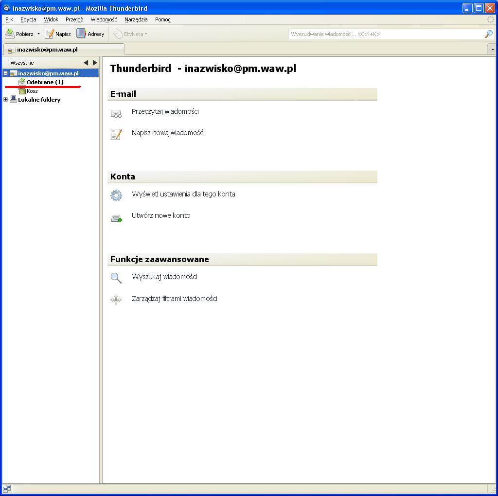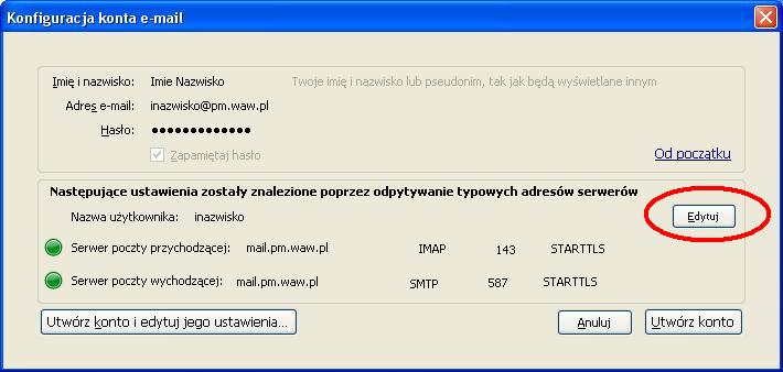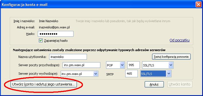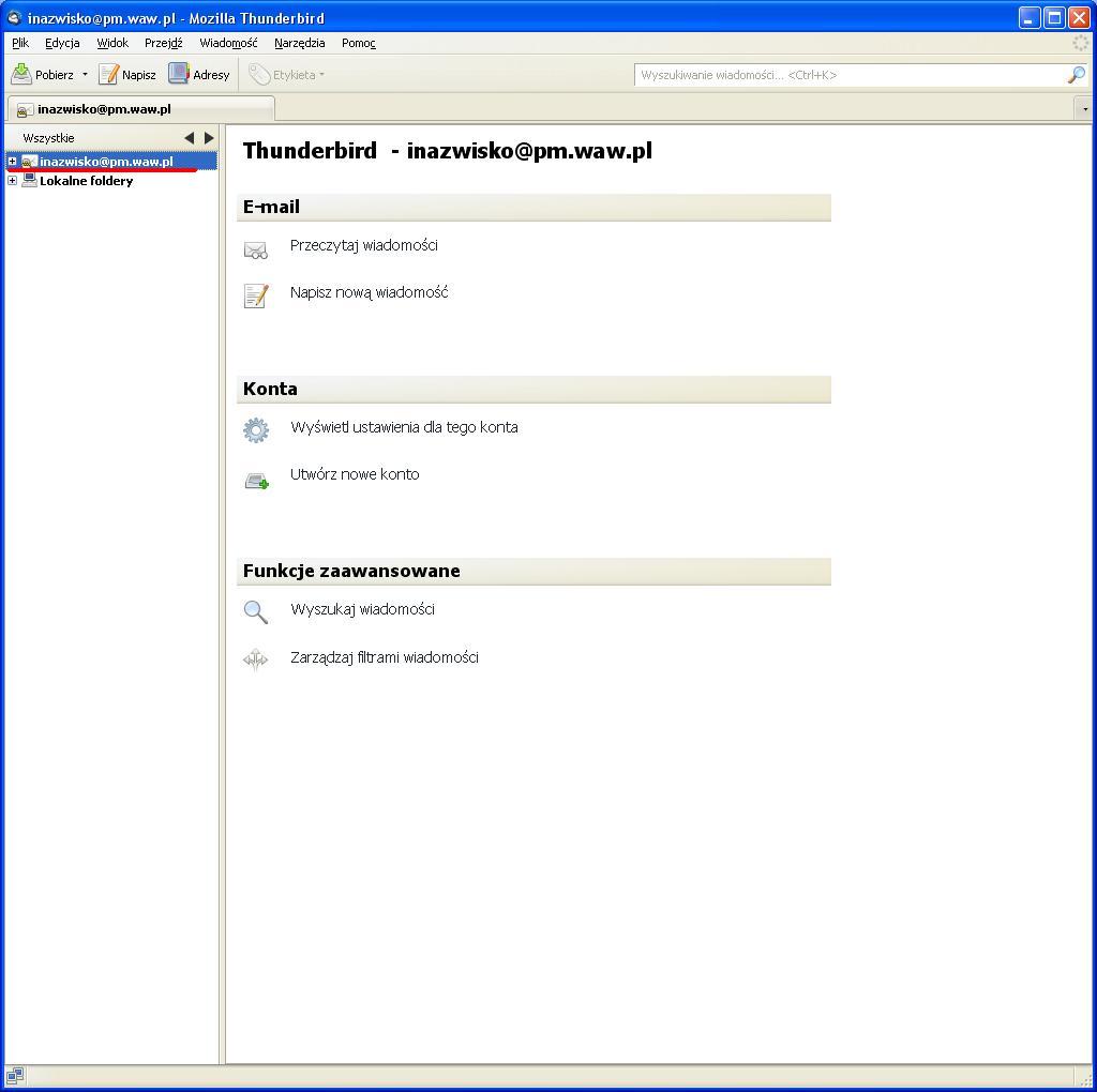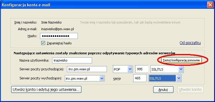 Ustawienia poczty elektronicznej - KROK PO KROKUInstrukcja przygotowana zostala dla programu MOZILLA THUNDERBIRD (jest todarmowy program do pobrania z internetu). Ponizsza instrukcja przygotowana zostala na przykladzie wersji 3.1.4.Zgodnie z ta instrukcja mozemy skonfigurowac nasze konto zarowno w PM jak i w domu. Uwaga: W ponizszej instrukcji korzystam ze specyfiki nazw uzytkownikow w sieci tj Pierwszej litery imienia i nazwiska - inazwisko np: Agnieszka Kowalska - uzytkownik: akowalska, Wojtek Szyc - uzytkownik: wszyc. Pobieramy program z internetu i instalujemy go na komputerze (instalacja jest bardzo prosta). Poniewaz jest to pierwsze uruchomienie programu na komputerze zobaczymy od razu kreator tworzenia konta. Kreator moze w pierwszym kroku zapytac czy nie chcesz imporotwac utawien z innych programow, dla bezpieczenstwa wybieramy Nie importuj niczego Po czym pojawi nam sie okno, ktore uzupelniamy program auomatycznie wyszuka ustawienia ktore bedziemy musieli poprawic wybierajac przycisk EDYTUJ zmieniamy po kolei serwery poczty przychodzacej i wychodzacej na inx.pm.waw.pl zmieniamy opcje IMAP na POP3 oraz numery portow odpowiednio 995 i 465 oraz opje STARTTLS na SSL/TLS po czym wybieramy opcje Testuj konfiguracje ponownie. Poprawna konfiguracja wyglada tak: Podczas testu konfiguracji pojawi sie nam blad certyfikaty ktory nie jest zainstalowany w systemie a jest wymagany przy szyfrowanych haslach. Wybieramy Potwierdz wyjatek bezpieczenstwa Wybieramy Utworz konto i edytuj jego ustawienia W lewym oknie zaznaczamy Konfiguracja serwera i zmieniamy Metode uwierzytelniania na Szyfrowane haslo, powinno to wygladac tak: i wybieramy przycisk OK wybieramy przycisk OK (jezeli nie chcemy tego komunikatu za ka¿dym razem odznaczamy sprawdzanie przy kazdym uruchomieniu) W tej chwili mozemy juz korzystac z poczty Palacowej choc przy kazdym uruchomieniu program wyswietli nam komunikat o braku certyfikatu serwera. Nie przeszkadza to w korzystaniu z poczty, ale kilkoma prostymi operacjami przedstawionymi ponizej mozemy ten certyfikat zainstalowac. Najlatwiej zainstalowac certyfikat korzystajac z przegladarki internetowej INTERNET EXPLORER (jezeli czytasz te instrukcje za pomoca tej przegladarki to skorzystaj z tego linku: SMTP/TLS, POP3/SSL i IMAP/SSL. ) , po jej uruchomieniu w polu adresu wpisujemy adres admin.pm.waw.pl. W zakladce Ustawienia poczty wybieramy link do certyfikatow wybieramy ZAINSTALUJ CERTYFIKAT wybieramy DALEJ wybieramy DALEJ wybieramy ZAKONCZ wybieramy TAK wybieramy OK wybieramy OK i od tej chwili cieszymy sie dzialajaca poczta Palacowa z certyfikatem serwera PM . Mam nadzieje ze instrukcja byla pomocna.